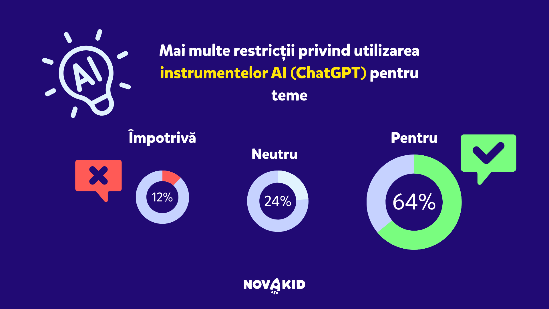 Realizarea exercițiilor pentru acasă este o activitate importantă din rutina școlarilor, care ar trebui realizată, conform părinților, cu o mai mică implicare a instrumentelor bazate pe inteligența artificială, precum ChatGPT. Întrebați dacă sunt în favoarea mai multor restricții privind utilizarea instrumentelor AI pentru teme, ei au răspuns: